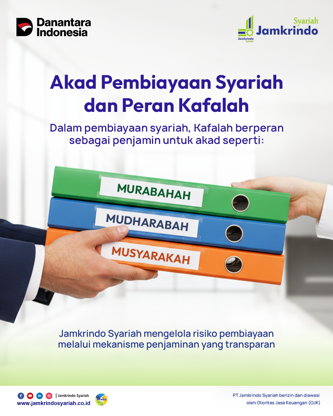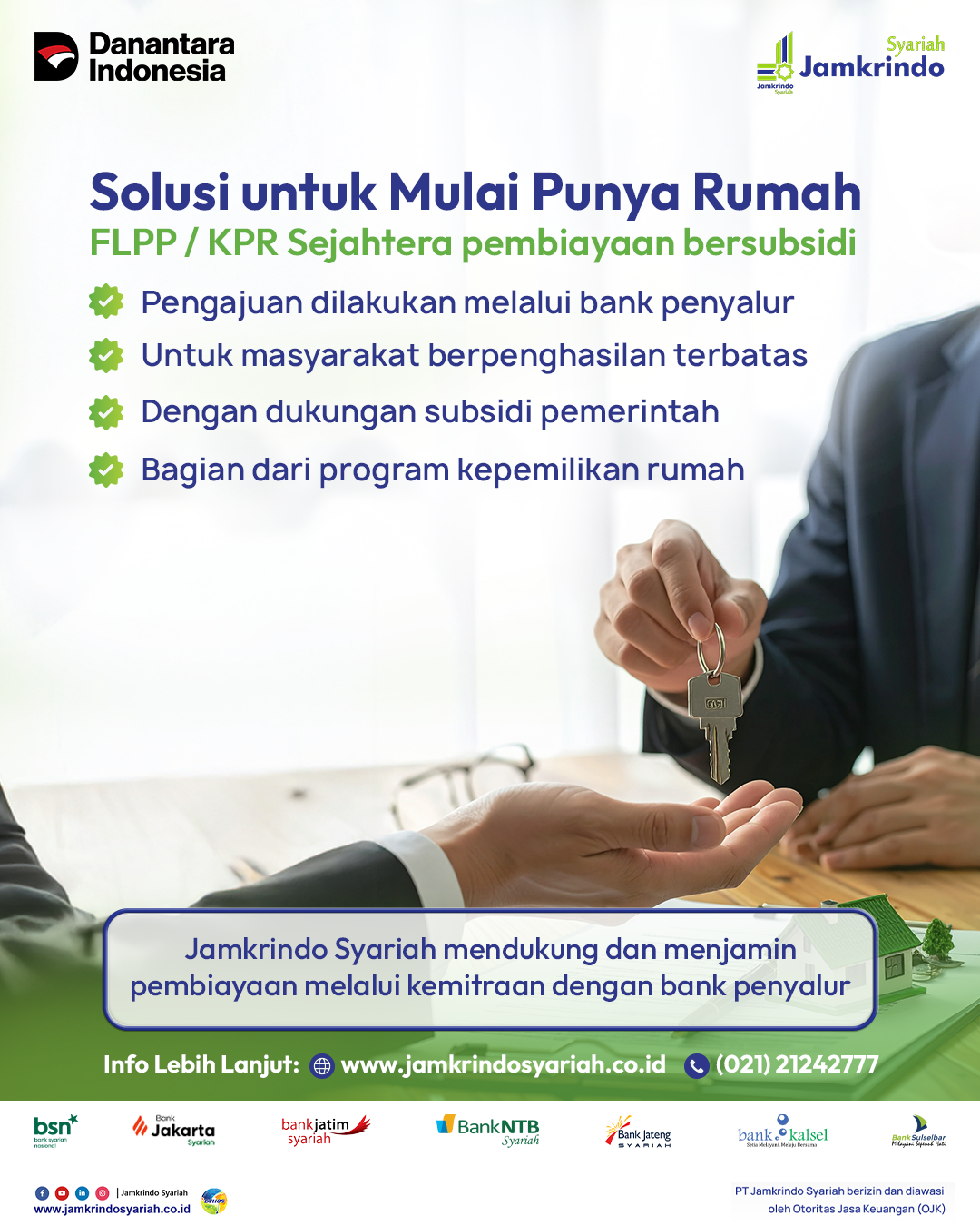 Jamkrindo Syariah bermitra dengan perbankan, Bank Perkreditan Rakyat syariah, fintech, dan lembaga keuangan untuk menyediakan penjaminan syariah.